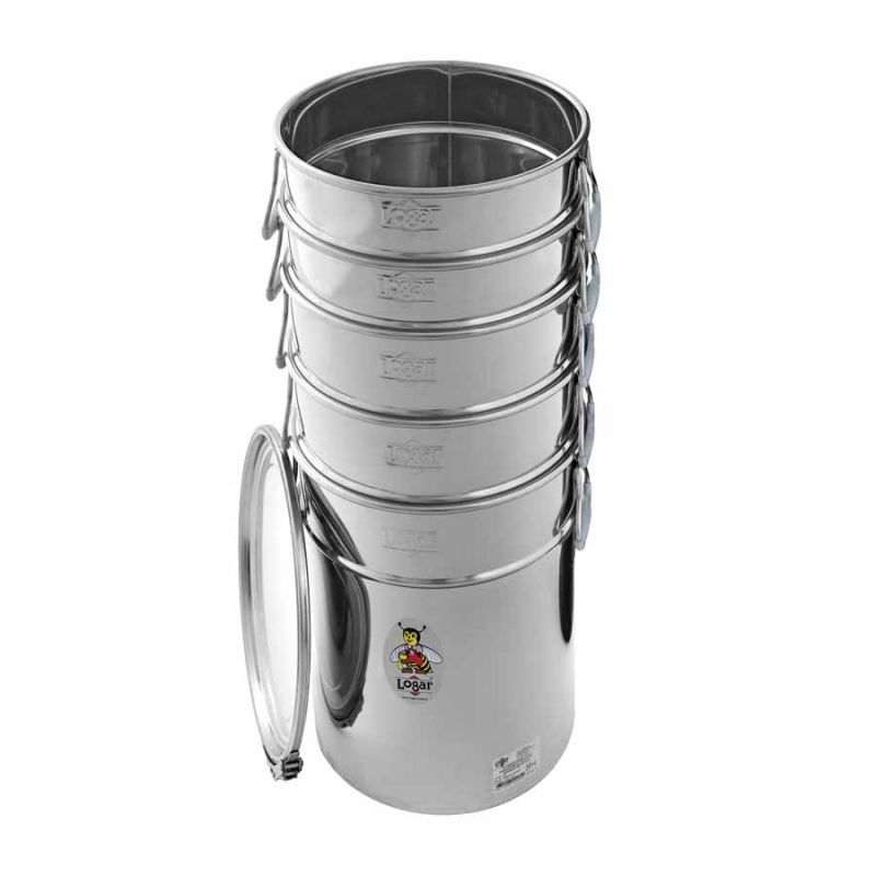 Geschikt voor: opslag van honing en andere levensmiddelen – capaciteit 50 kg. Binnenmaat boven Ø 307 mm, onder Ø 293 mm, hoogte 49 cm.