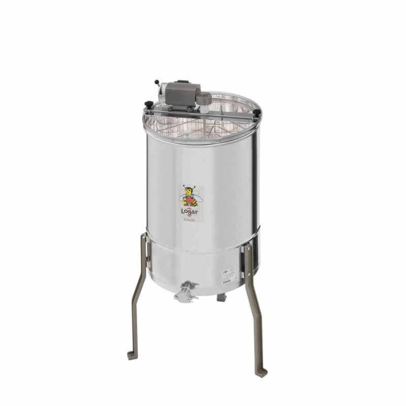 3-ramen honingcentrifuge van Logar met motoraandrijving 110 W / 230 V. De centrifuge is voorzien van een geïntegreerde veiligheidsschakelaar die de motor automatisch uitschakelt bij het openen van het deksel. De roestvrije knijpkraan is aan het laagst mogelijke punt vastgelast, zodat alle honing uit de centrifuge kan wegstromen. Alle onderdelen die met honing in contact komen zijn vervaardigd uit levensmiddelgoedgekeurde materialen.