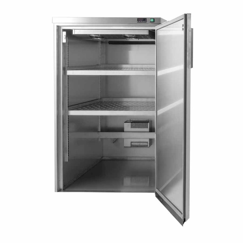 De kast is volledig vervaardigd uit roestvrij materiaal en voldoet aan de hoogste hygiënenormen. Hij kenmerkt zich door hoge kwaliteit en lange levensduur. De bediening van het apparaat is eenvoudig en gebruiksvriendelijk; de nauwkeurige afwerking maakt eenvoudige reiniging mogelijk.