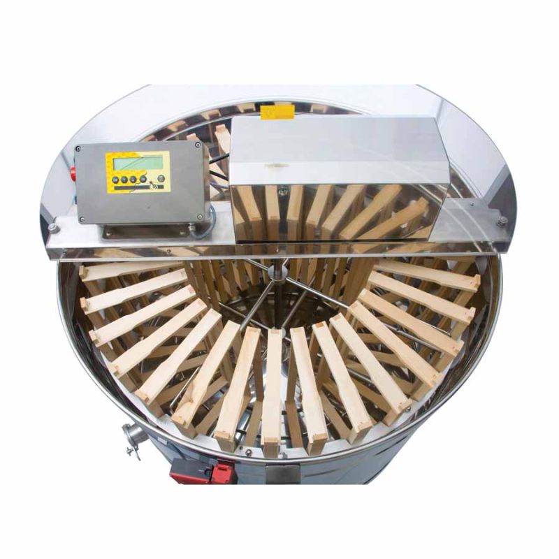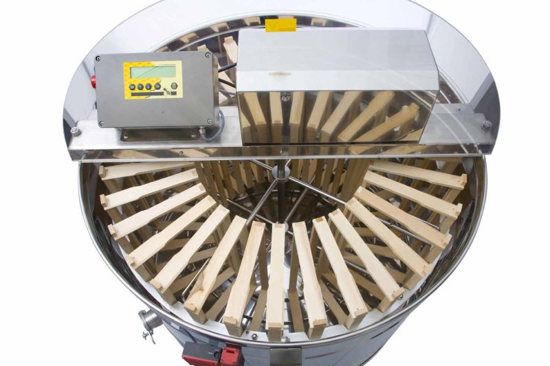 32-ramen radiale honingcentrifuge, met motoraandrijving 370 W / 230 V, volautomatische besturing en geïntegreerde veiligheidsvoorziening die de motor automatisch uitschakelt bij openen van het deksel. Moderne techniek maakt een innovatieve uitvoering van de bodem van de centrifuge mogelijk. De bodem van de ketel is naadloos gelast en naar de uitloop toe hellend. De centrifuge heeft twee roestvrijstalen aftapkranen (6/4'' en 2''). De aftapkraan 2'' is op het laagst mogelijke punt gemonteerd, zodat alle honing uit de centrifuge kan vloeien. Alle delen van de centrifuge die met honing in aanraking komen, zijn gemaakt van voedselveilige materialen. Het deksel is van transparant acrylglas.