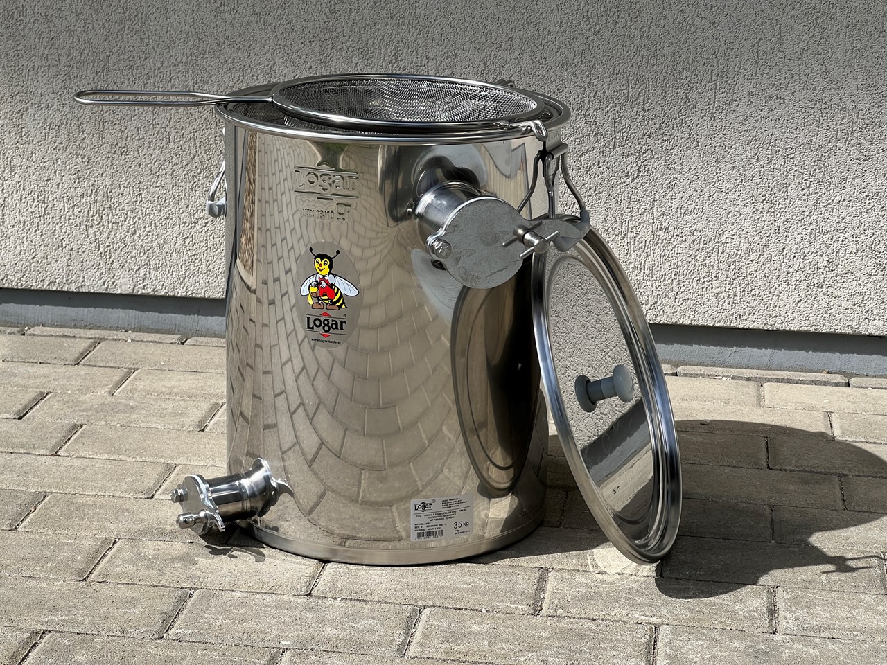 - Uitrusting: 2 aangelaste knijpkranen (bovenste XL-knijpkraan voor verhoogde honingdoorstroom), fijn binnenzeef van roestvrijstalen gaasstof
