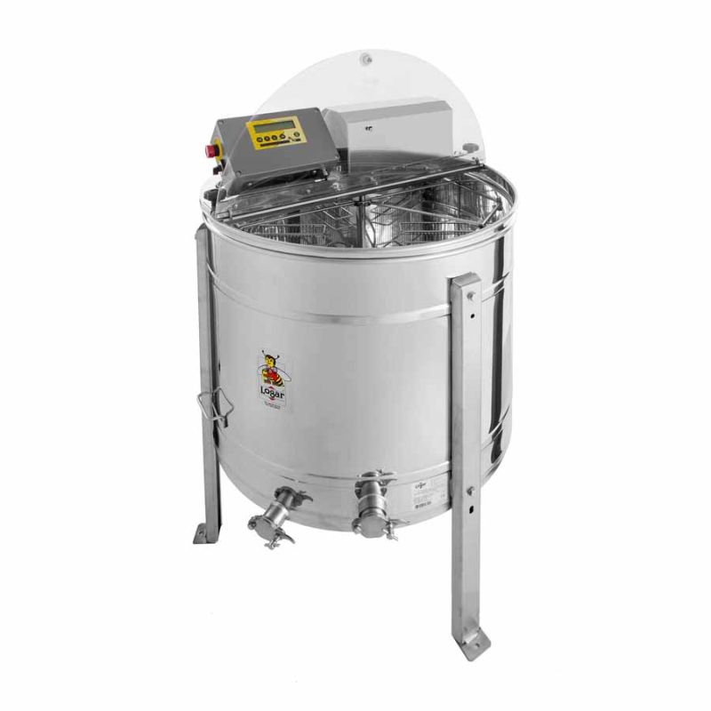 4‑raams zelfkerende honingcentrifuge met motor 180 W / 230 V en volledig automatische besturing. De centrifuge heeft een geïntegreerde veiligheidsschakelaar die de motor bij het openen van het deksel automatisch uitschakelt. Moderne techniek zorgt voor een naadloos gelaste ketelbodem die naar de aftap toe helt; de roestvrijstalen knijpkraan is op het laagst mogelijke punt aangebracht zodat alle honing kan weglopen. Alle onderdelen die met honing in contact komen zijn vervaardigd uit voedselveilige materialen. Het deksel is gemaakt van transparant acrylglas.