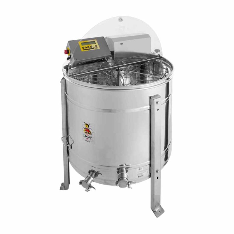 4-ramen zelfomkerende honingcentrifuge met motor 180 W / 230 V en volledig automatische besturing. De centrifuge heeft een geïntegreerde veiligheidschakelaar die de motor automatisch uitschakelt bij het openen van het deksel. Moderne techniek maakt een vernieuwende uitvoering van de bodem van de centrifuge mogelijk. De bodem van de ketel is naadloos gelast en is hellend naar de uitloop toe uitgevoerd. De roestvrijstalen knijpkraan is op het laagst mogelijke punt gemonteerd, zodat alle honing uit de centrifuge kan lopen. Alle onderdelen die met honing in contact komen zijn uitgevoerd in voedselveilige materialen. Het deksel is van transparant acrylglas. Deze honingcentrifuge maakt het mogelijk grotere ramen te slinger tot een hoogte van 28,6 cm. Daarom wordt het deksel met behulp van speciale scharnieren over de motor geopend.