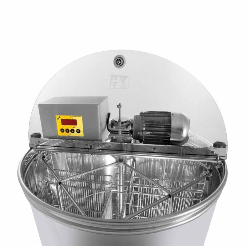 4-ramen zelfwendende honingslinger met motor 110 W / 230 V, volautomatische besturing en een veiligheidsschakelaar die de motor bij het openen van de kap automatisch uitschakelt. Moderne techniek heeft ons in staat gesteld de bodem van de slinger op een innovatieve manier uit te voeren. De bodem van de ketel is naadloos gelast en naar de aftapzijde hellend uitgevoerd. De roestvrijstalen knijpkraan is op het laagst mogelijke punt aangebracht zodat alle honing uit de slinger kan stromen. Alle onderdelen die met honing in aanraking komen, zijn gemaakt van voedselveilige materialen. De kap is van transparant acrylglas. Een speciale constructie van de poten zorgt voor een stabiele stand.