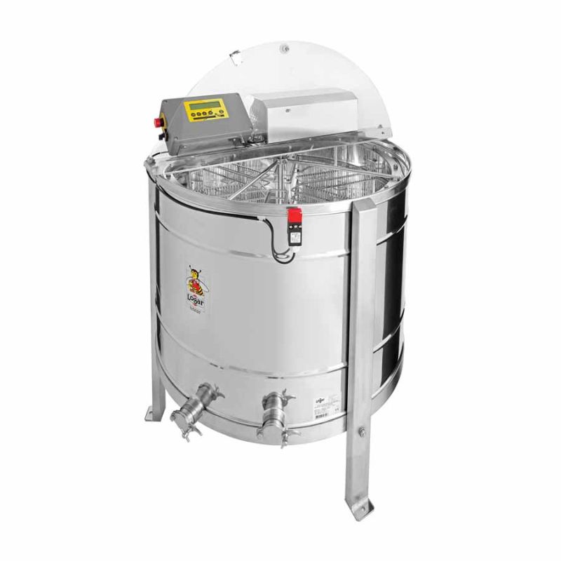 6-raams zelfwendende honingslinger van Logar, met elektromotor 250 W / 230 V, volautomatische besturing en geïntegreerde veiligheidsvoorziening die de motor bij openen van het deksel automatisch uitschakelt. De slinger is uitgerust met twee roestvrijstalen knijpkranen 6/4''; één daarvan is op het laagste punt gemonteerd zodat alle honing kan wegstromen. Alle onderdelen die met honing in aanraking komen zijn van voedselveilige materialen. Het deksel is van transparant acrylglas.